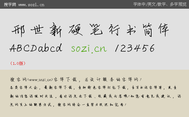搜字網所有字體源于網絡分享,免費供大家學習交流。除有廠商申明可免費商用以外,都僅限個人非商業(yè)使用。未獲字體開發(fā)方商用授權的,嚴禁擅自商用,因此造成的侵權責任須自行承擔。本站不承擔任何版權責任和糾紛,本站出于愛好而建,善意免費為各類字體開發(fā)者宣傳推廣,您認為有任何不妥之處,請與我們聯(lián)系,將會第一時間給您答復!