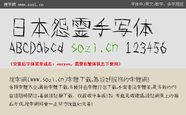 搜字網(wǎng)所有字體源于網(wǎng)絡(luò)分享,免費(fèi)供大家學(xué)習(xí)交流。除有廠商申明可免費(fèi)商用以外,都僅限個人非商業(yè)使用。未獲字體開發(fā)方商用授權(quán)的,嚴(yán)禁擅自商用,因此造成的侵權(quán)責(zé)任須自行承擔(dān)。本站不承擔(dān)任何版權(quán)責(zé)任和糾紛,本站出于愛好而建,善意免費(fèi)為各類字體開發(fā)者宣傳推廣,您認(rèn)為有任何不妥之處,請與我們聯(lián)系,將會第一時間給您答復(fù)!